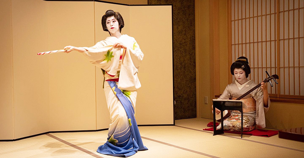 Guests dine at a traditional restaurant called a ryotei, enjoy the singing and dancing of the geisha, and have the opportunity to engage in conversation with them.